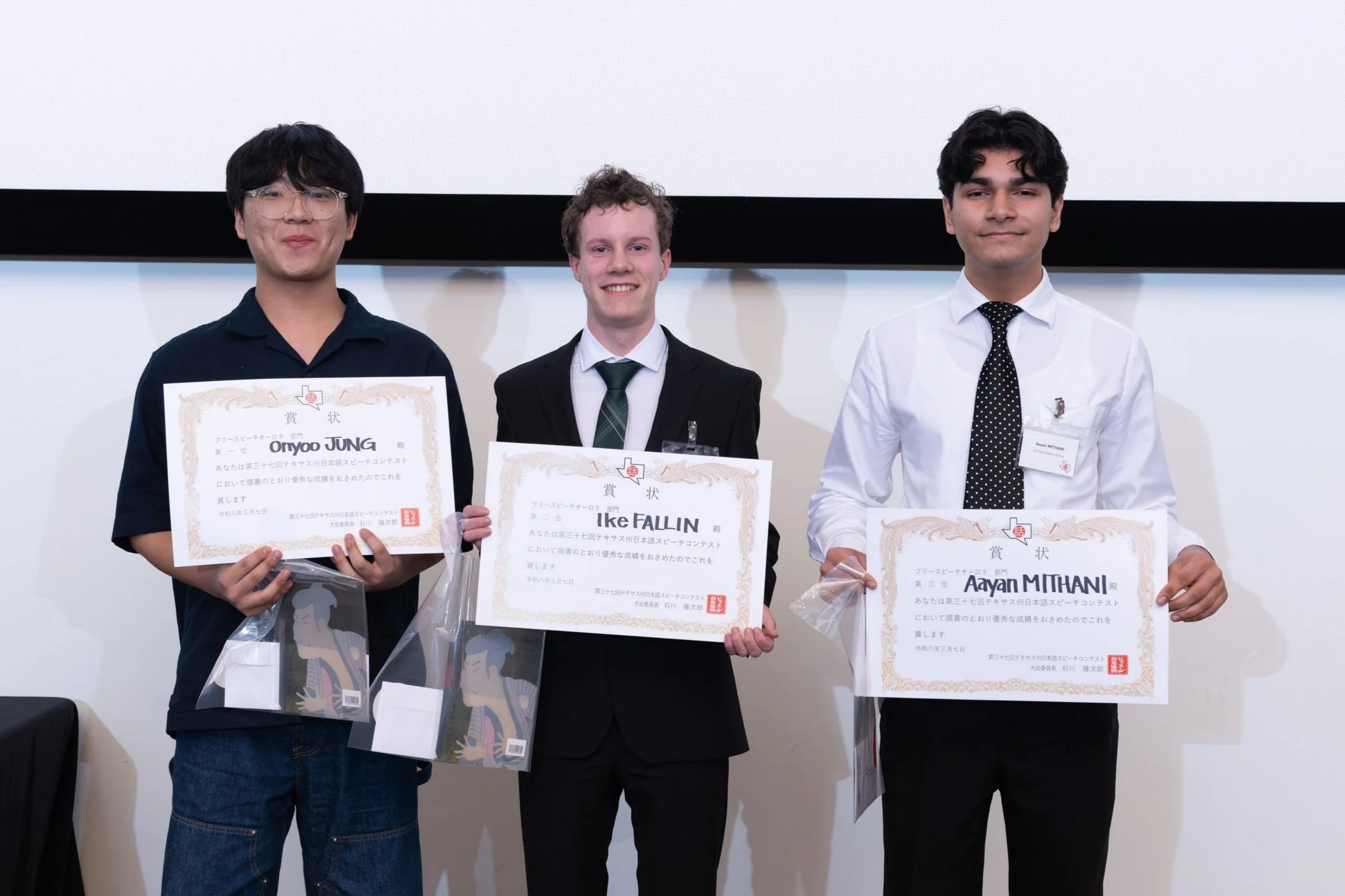 Winners of the H.S. FREE SPEECH AURORA DIVISION received scholarships from the Japanese Association of Greater Houston (JGAH): $500 for 1st Place, $300 for 2nd place, and $200 for 3rd Place.